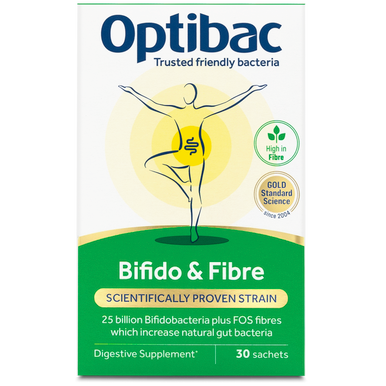 Optibac Probiotics Bifido & Fibre combines the highly researched probiotic strain Bifidobacterium lactis BB-12 with 4g of prebiotic FOS fibers to increase natural gut bacteria, improve regularity and aid occasional constipation.